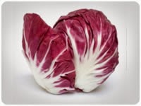 Радиччио, красный цикорий Небольшие кочаны имеют окраску от бело-розового до темно-фиолетового и темно-красного с белыми прожилками. Листья выглядят очень декоративно, их используют в свежем виде, смешивая с другими сортами салата. Можно добавлять радиччо в горячие овощные и мясные блюда. На вкус радиччио достаточно горький, поэтому к нему подходит майонез и заправки с медом, голубым сыром, цитрусовым или фруктовым соком. Если лишняя горечь в блюде не нужна, листья радиччио можно бланшировать, цвет при этом не пострадает, листья станут немного мягче, а вкус менее горьким.